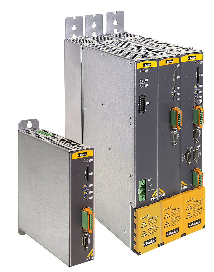 Die neue Servoantriebsfamilie von Parker. Der PSD1-S ist eine Stand-Alone Version, die direkt an das Netz angeschlossen wird. Der PSD1-M ist ein Mehrachs-Servosystem bei dem jedes Achs-Modul bis zu drei Servomotoren versorgen kann.