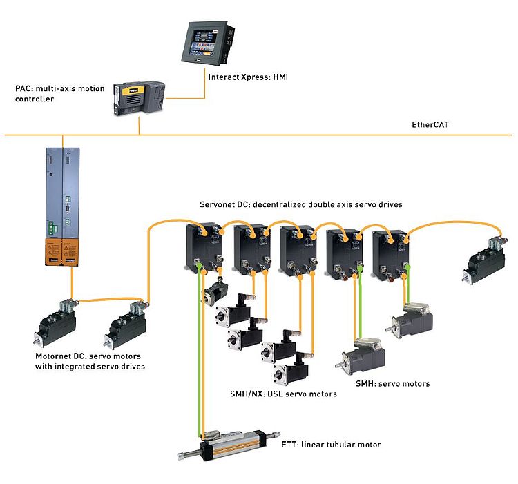 Dieses Beispiel zeigt Servonet DC kombiniert mit Motornet DC Servomotoren mit integrierten Servoantrieben, SMH/B Einkabel DSL Servomotorbaureihe, InteractXpress HMI und PAC Multiachs-Controller mit E/As als integrierte hybride Bewegungslösung. Diese Architektur kann für die gesamte Steuerung von Verpackungs- oder Prozesslinien genutzt werden.