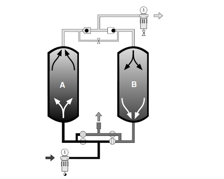 Die feuchte Druckluft fließt durch den Adsorptionsmittelbehälter A. Dabei wird die Druckluft getrocknet, indem der Wasserdampf durch die unausgeglichenen molekularen Anziehungskräfte gebunden wird. Wenn die molekularen Anziehungskräfte wieder ausgeglichen sind, muss das Mittel regeneriert werden und auf den zweiten Behälter B umgeschaltet werden. Regeneration bedeutet in diesem Fall, dass dem Adsorptionsmittel die Feuchtigkeit wieder entzogen wird. Wenn also Behälter A zur Trocknung der Druckluft benutzt wird, dann regeneriert sich Behälter B und umgekehrt.