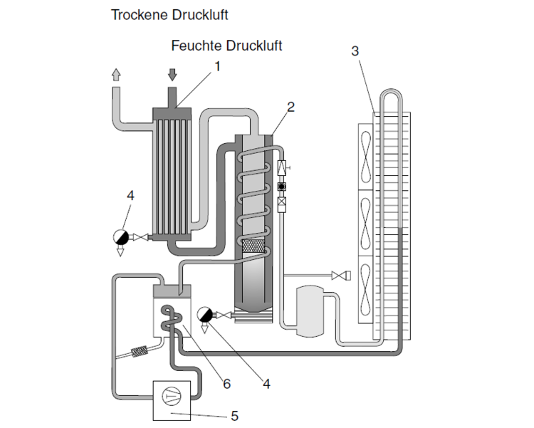 1 = Luft / Luft- Wärmeaustauscher 2 = Luft / Kältemittel- Wärmeaustauscher 3 = Kältemittel / Luft- Wärmeaustauscher | 4 = Kondensatableiter 5 = Kältekompressor 6 = Ausdampfer |